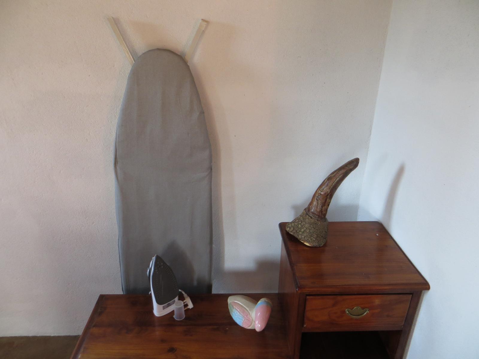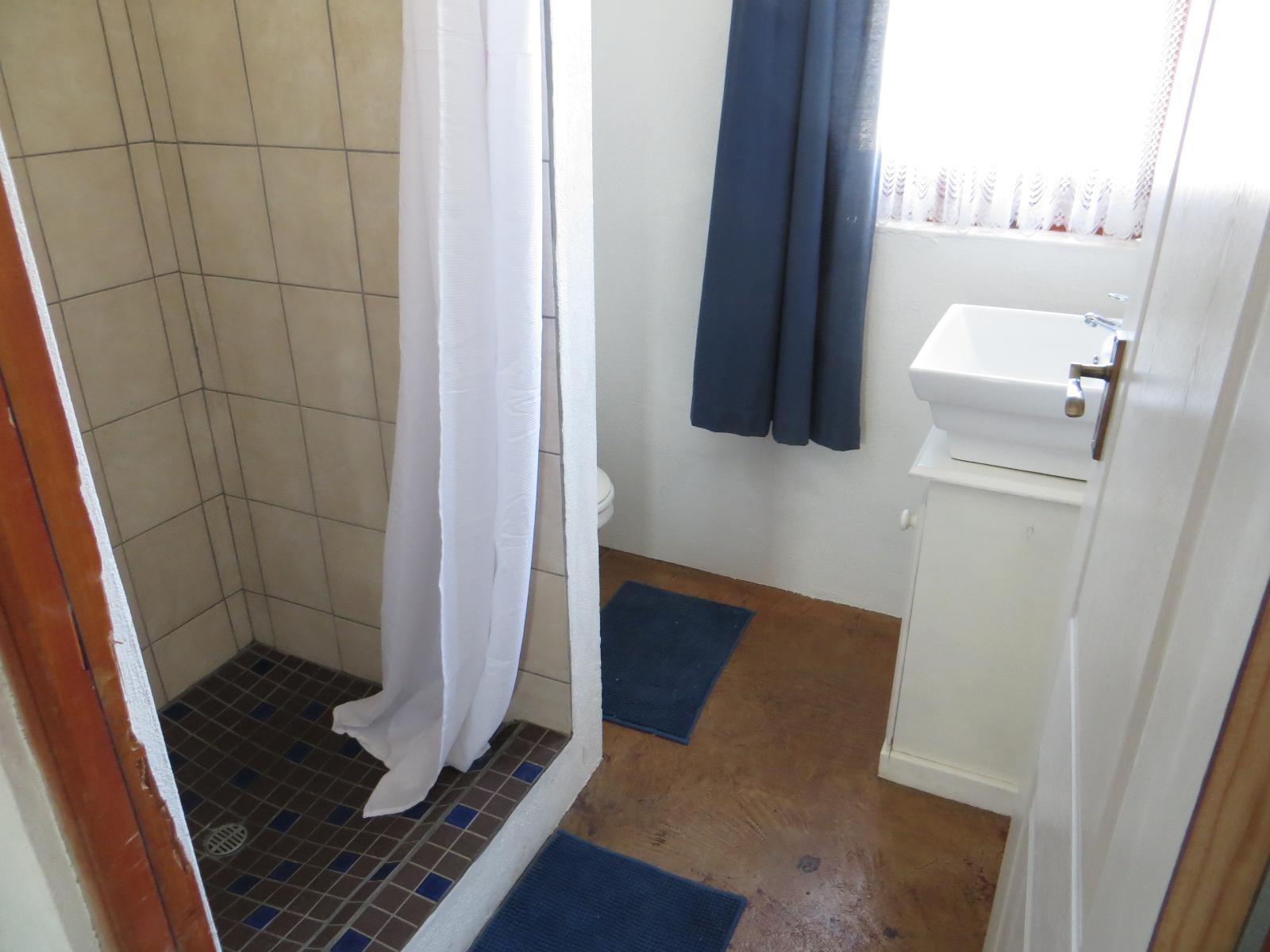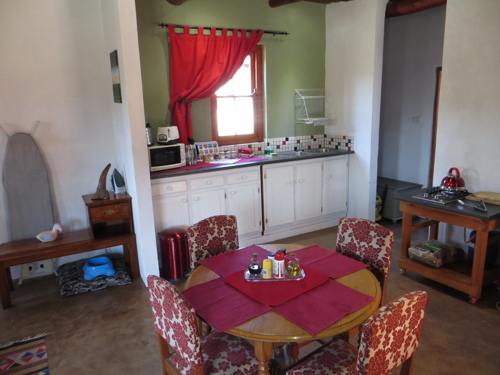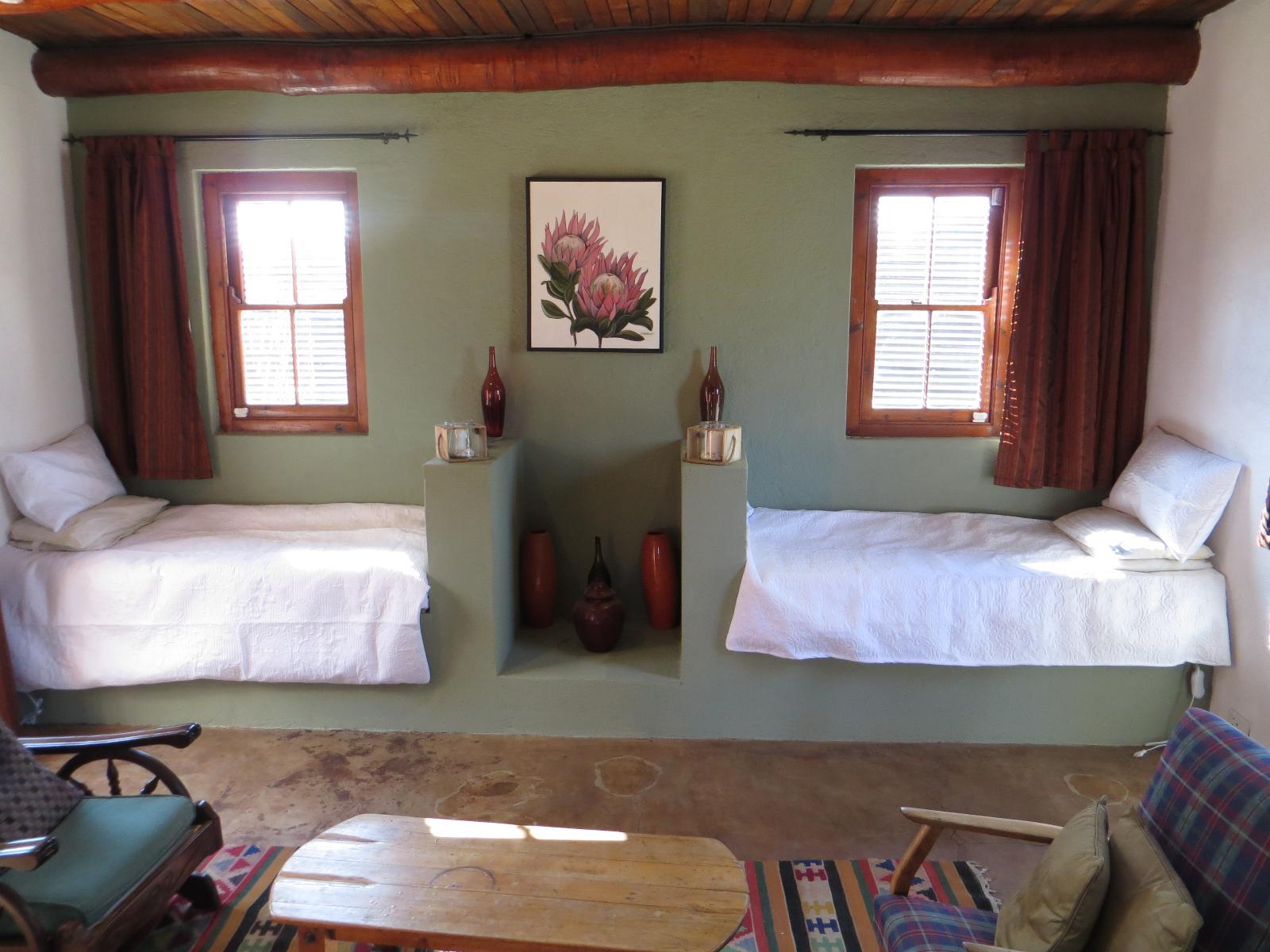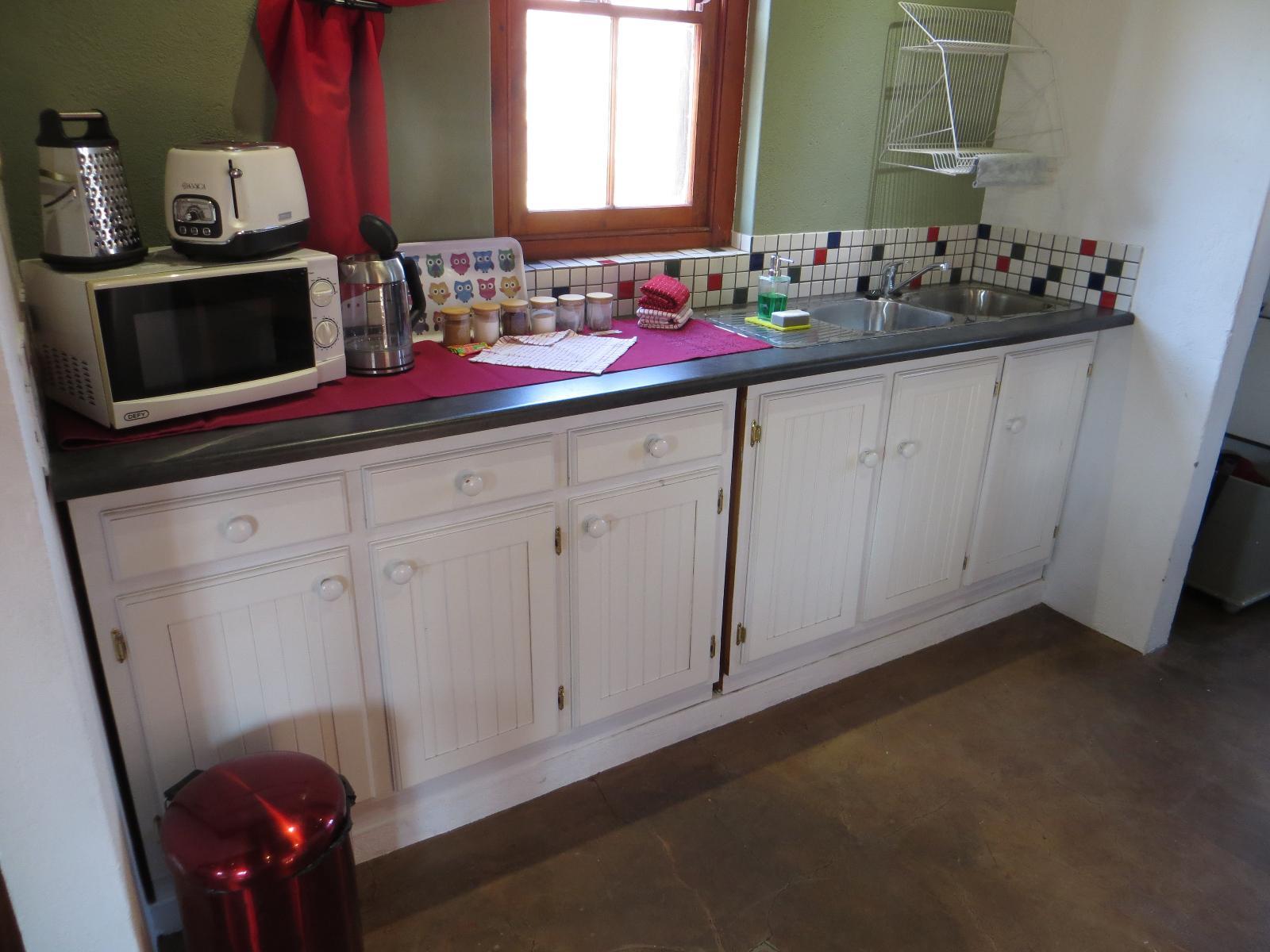 A Four-sleeper cottage with a King-size bed and 2 single beds in the lounge, a basic kitchen, gas plate, fridge, utensils, cutlery and crockery, shower, Wi-Fi, plus an outdoor braai area with seating.