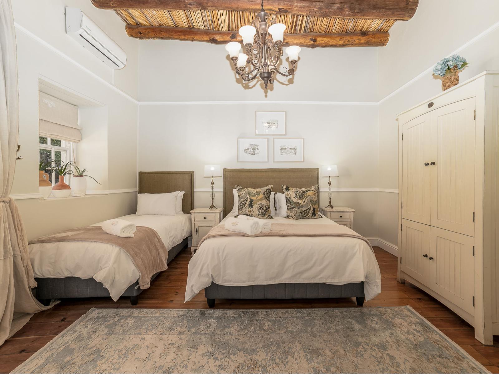 Our spacious en-suite queen & single bed reflects the charm of Cape Dutch-style architecture, featuring high ceilings and a private, air-conditioned space. The room includes a Smart TV, complimentary tea/coffee facilities, rusks, and an Espresso machine.