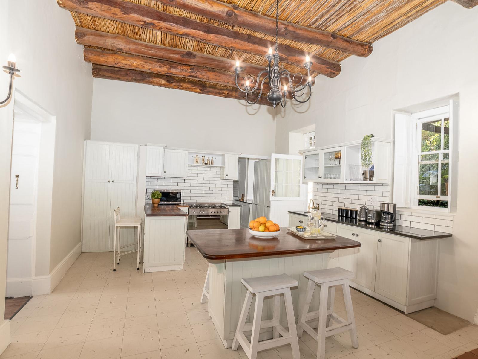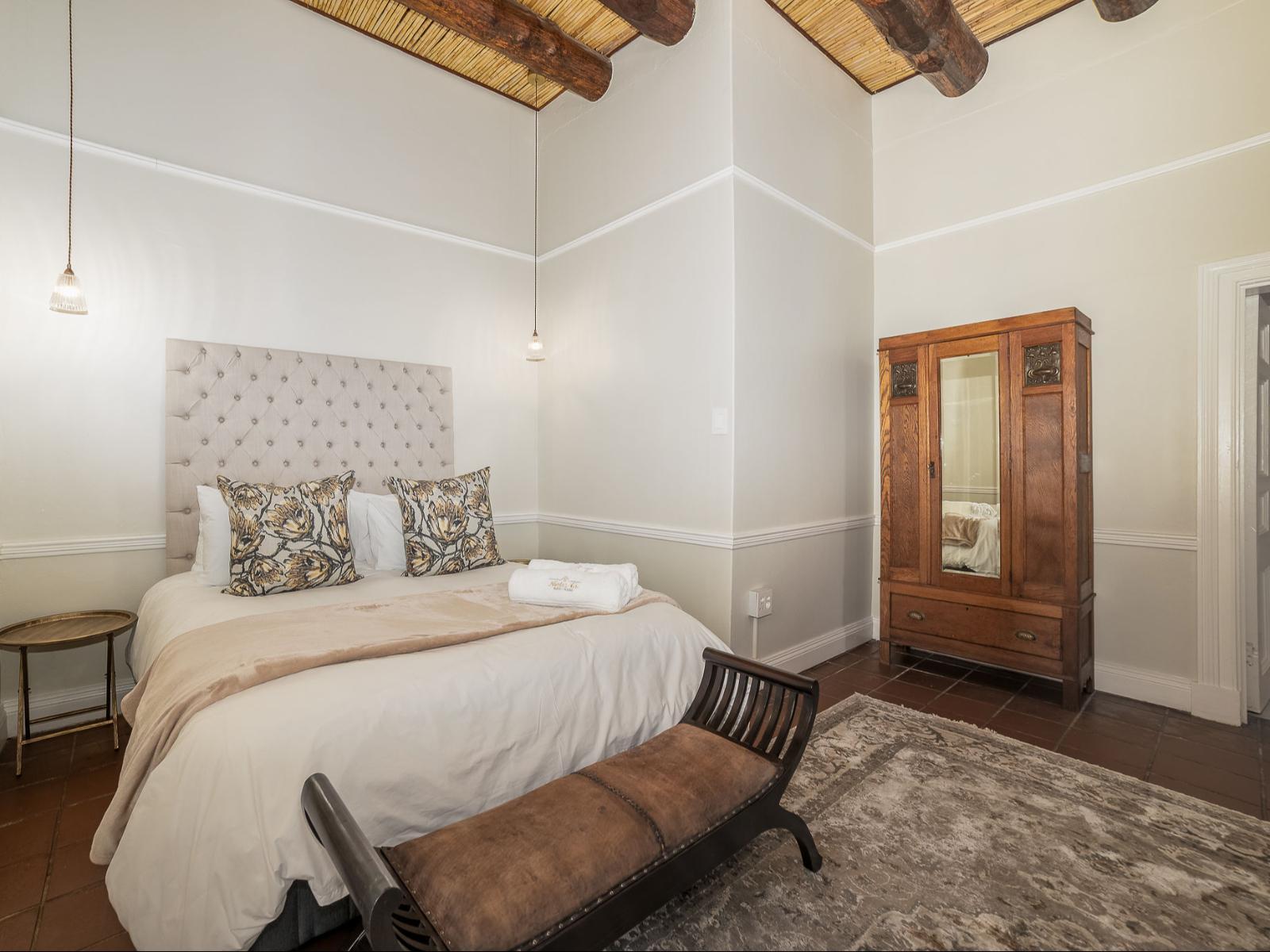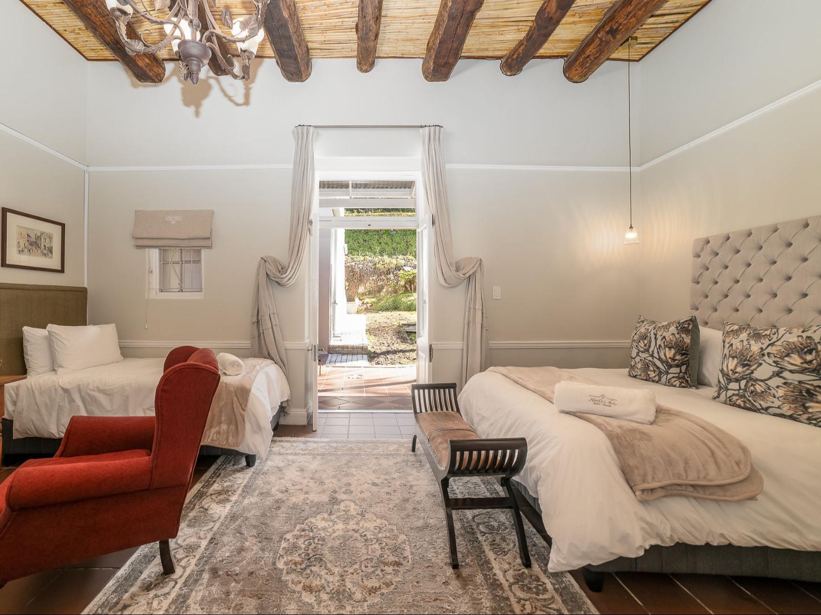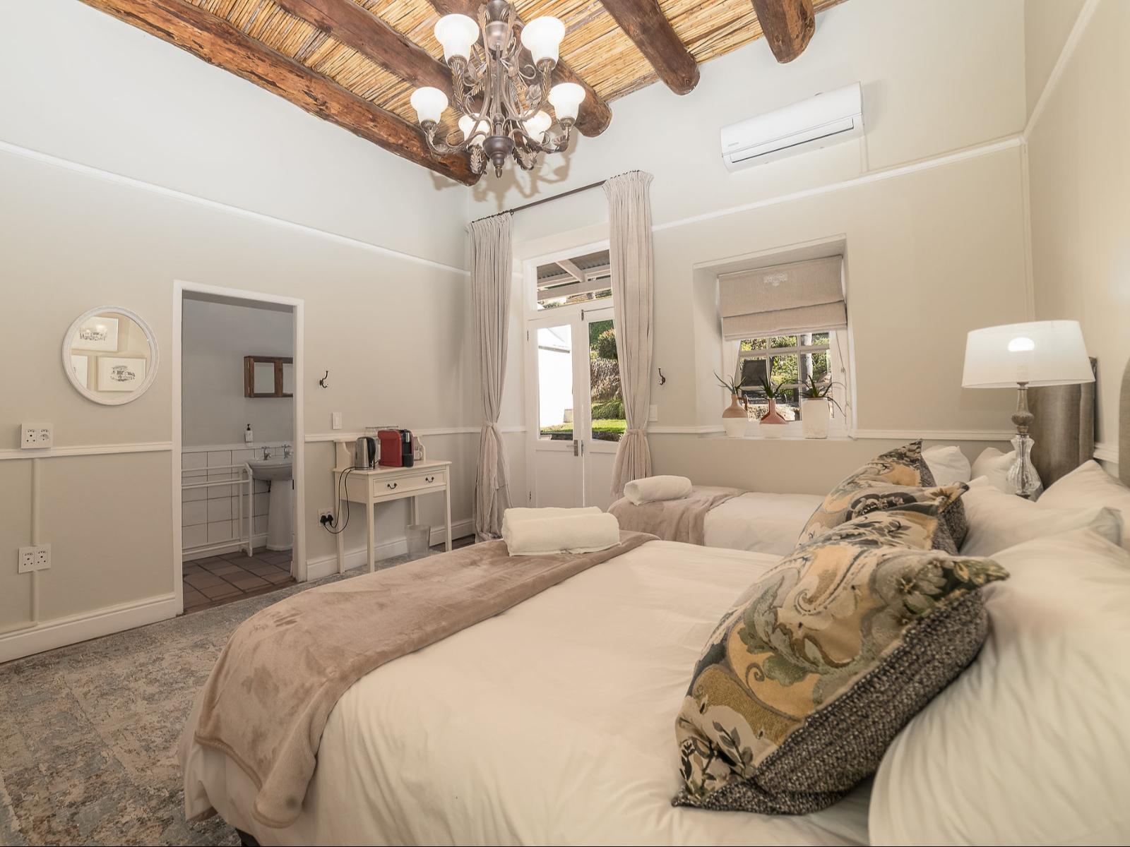 This spacious en-suite room offers a queen bed, Cape Dutch-style charm, high ceilings, and a private entrance. It includes aircon, a Smart TV, a bar fridge, and complimentary tea and coffee facilities, rusks, and an Espresso machine.