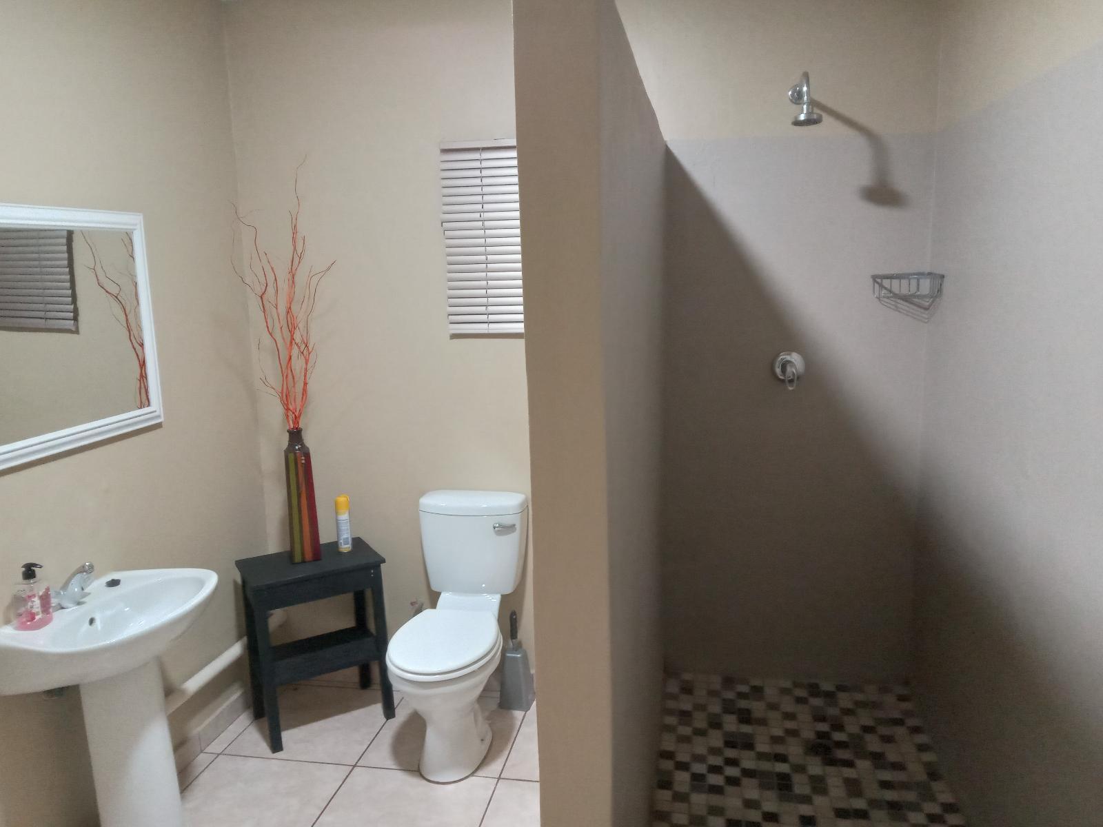 En-suite with shower only. The room has a King-size bed, TV, OVHD, kettle, own private entrance. Breakfast is optional at R85 per person. Breakfast is served @ The Flying Dutchman restaurant 150 metres from the B&B