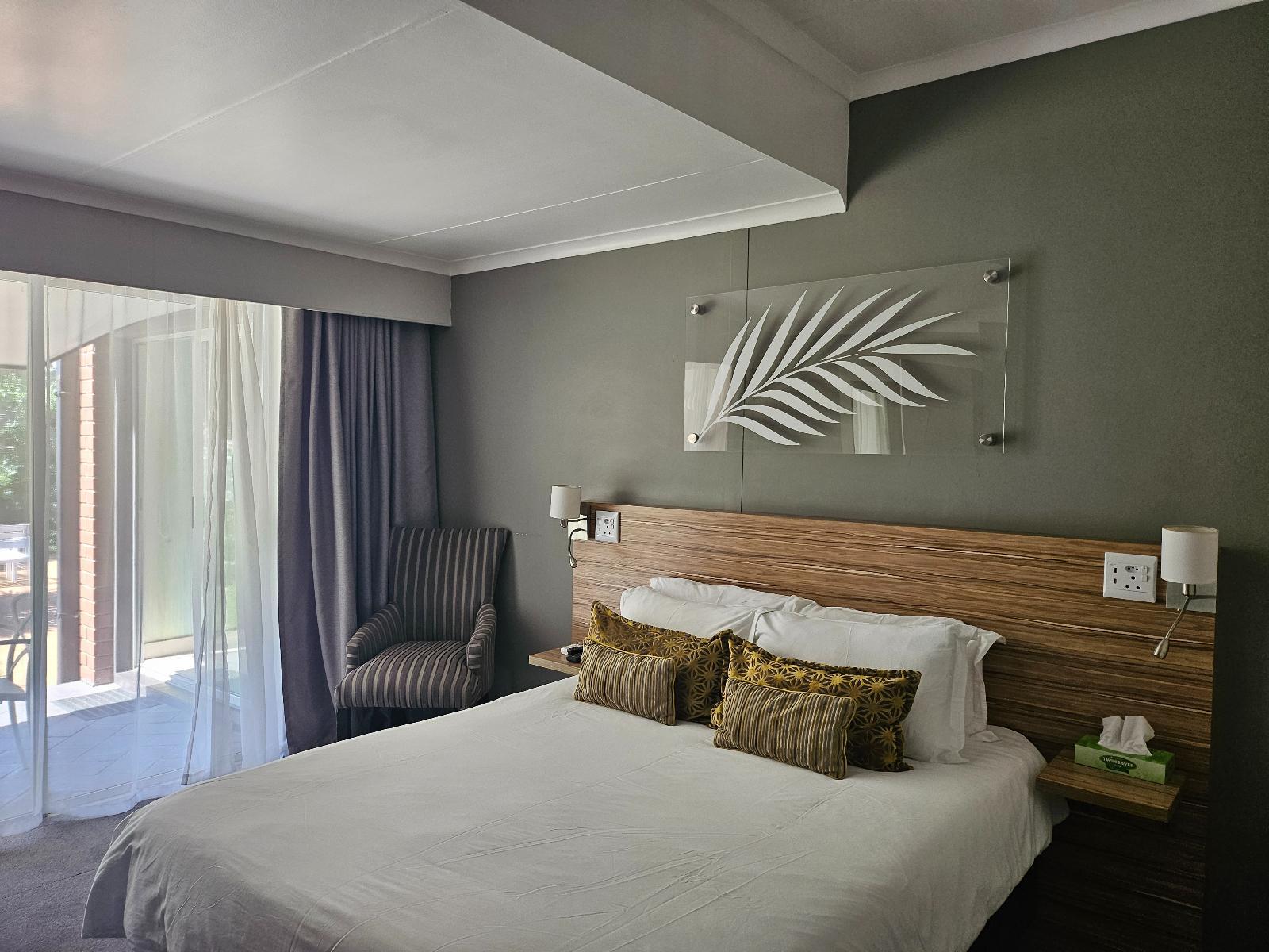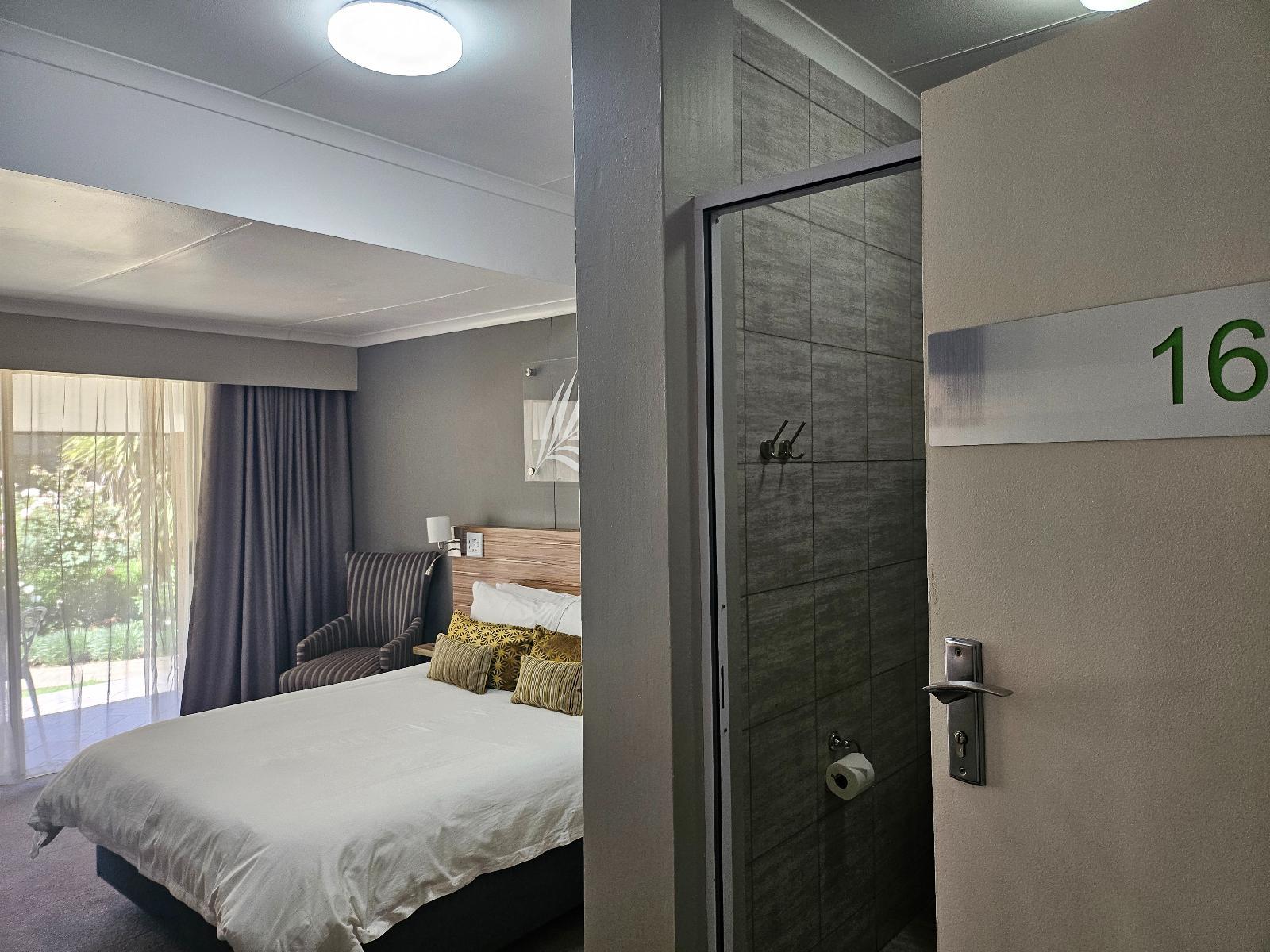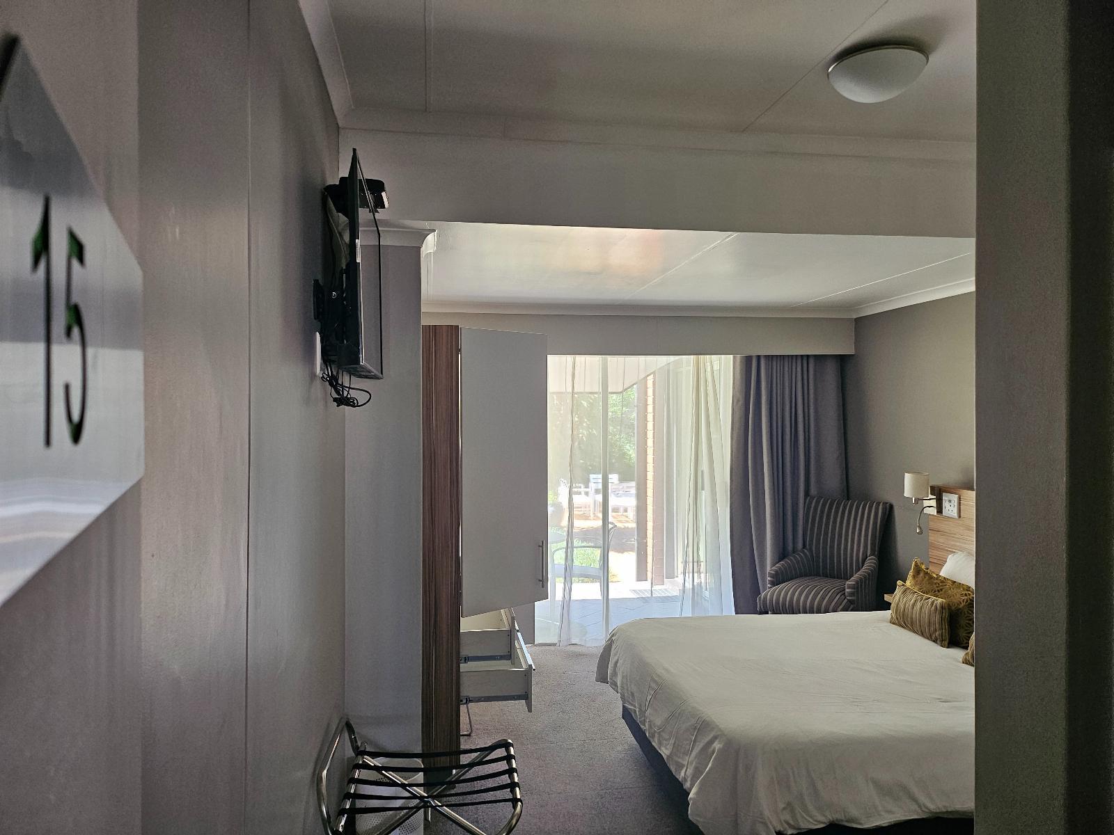 This room features a king-size bed, convertible to two singles on request, with an en-suite shower or a combined bath and shower. Amenities include air-con, bar fridge, coffee/tea facilities, TV with DStv, and free Wi-Fi for a comfortable stay.