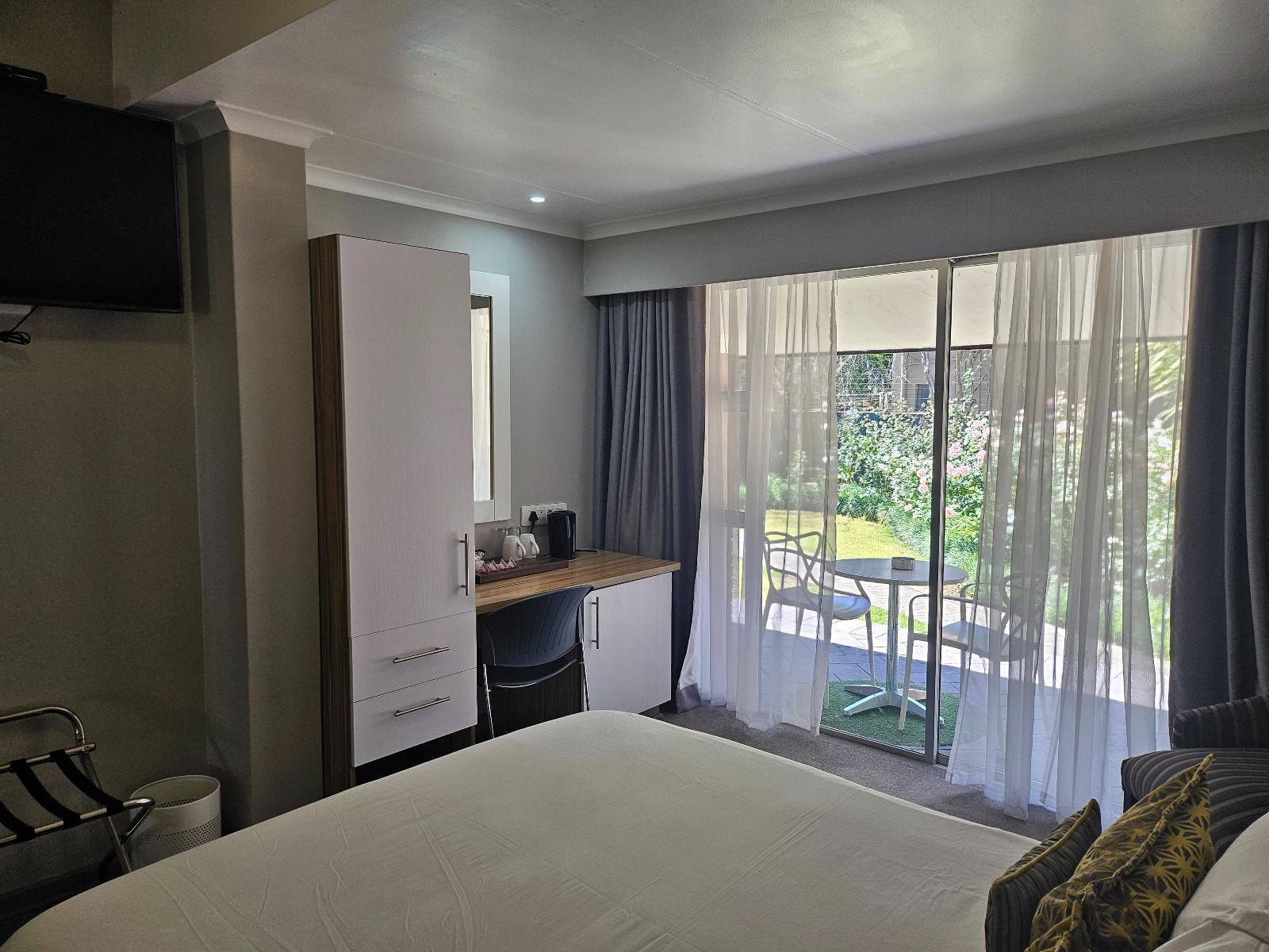 Standard double room featuring an en-suite bathroom with shower, air-conditioning, TV with DStv, coffee and tea facilities, bar fridge, and free Wi-Fi. Guests can also enjoy an inviting outdoor seating area beside the communal swimming pool.