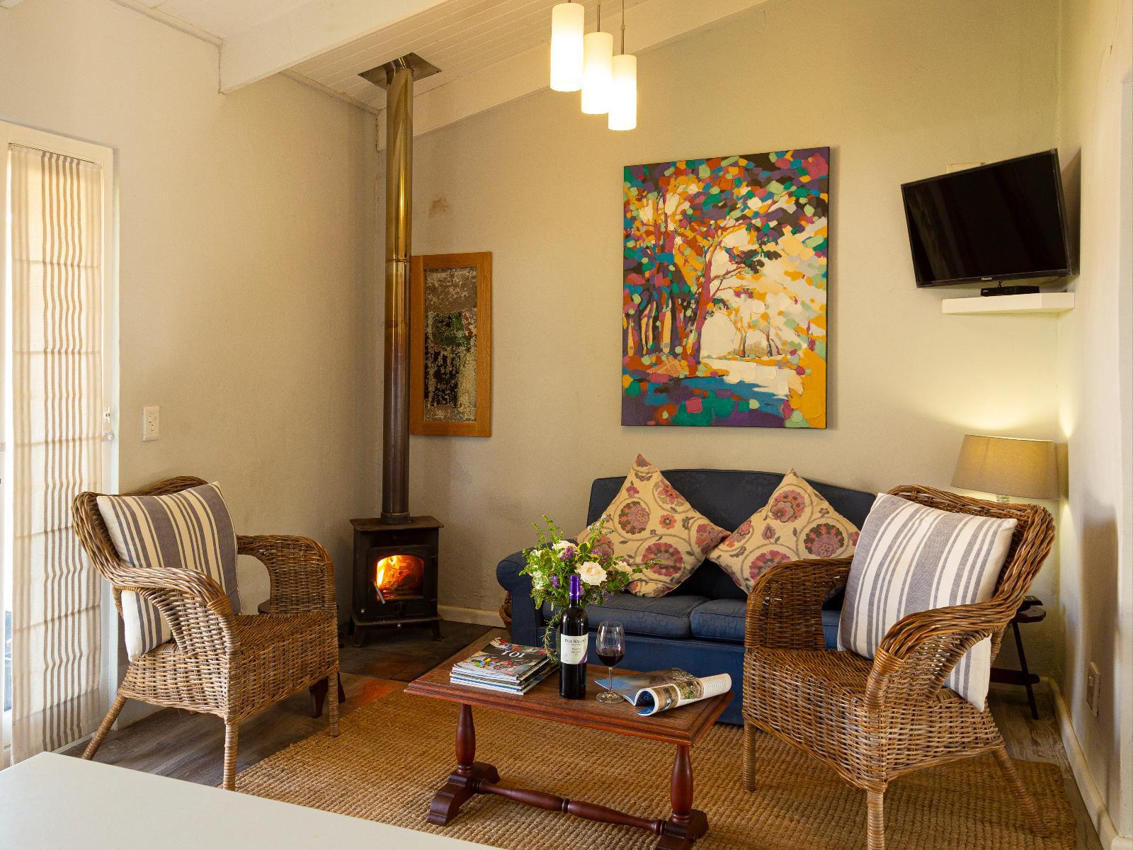 Cottage has a kitchenette fitted with stove-top & microwave, an open plan living area with fire place and DSTV. Two bedrooms, one queen & one king bed, (that can be made as two singles). Private outdoor braai with firewood etc. supplied. Shared bathroom