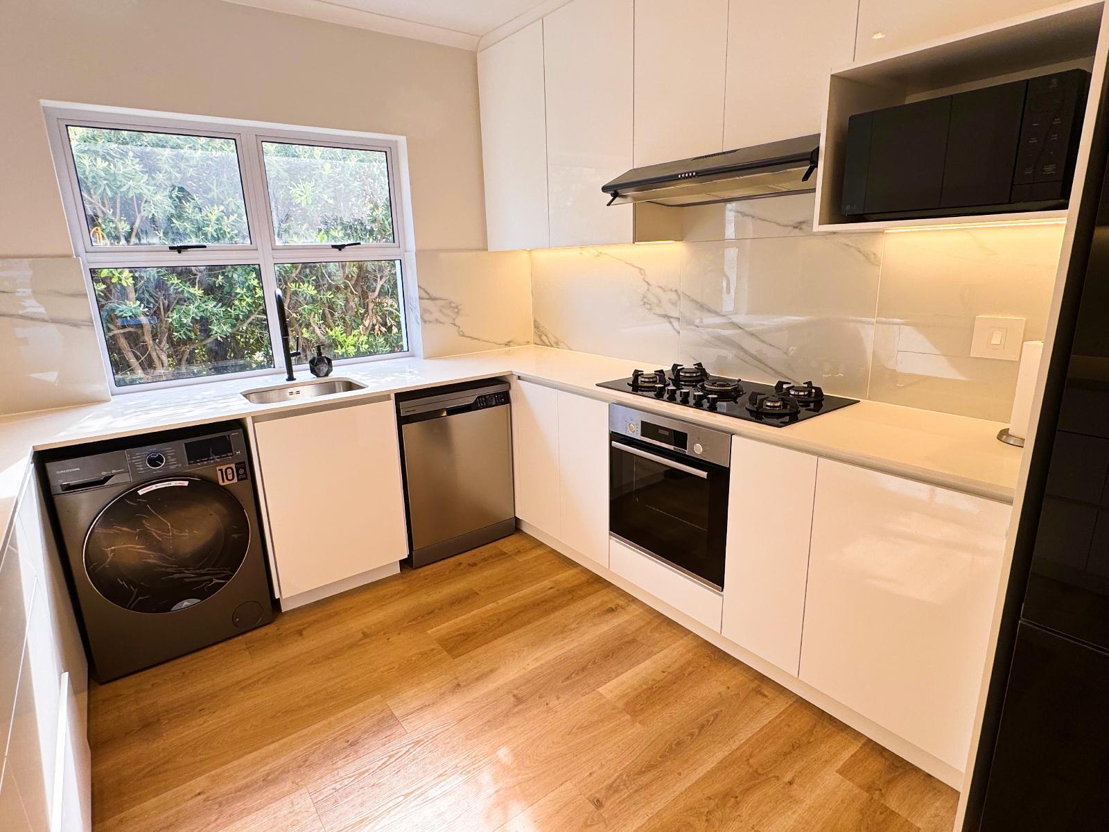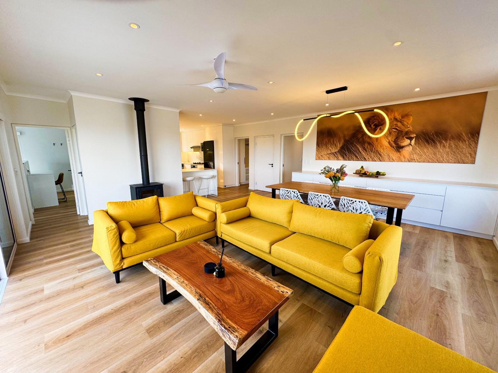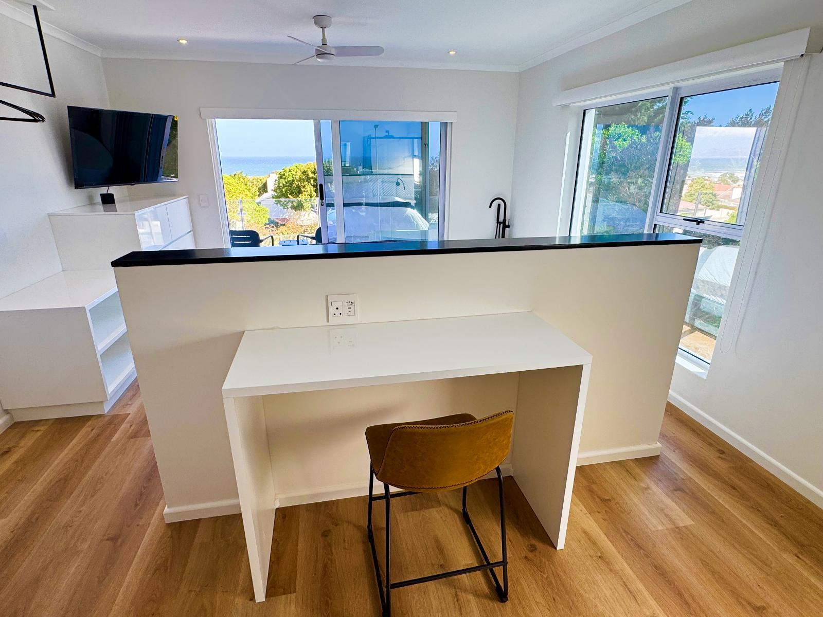 32 sqm self-catering studio with queen-size extra-length bed, open plan living/dining area, en-suite bathroom, Wi-Fi, 43’ smart TV with Netflix, patio with braai. Modern kitchen with fridge, hob, Nespresso coffee machine, washing machine, and appliances.