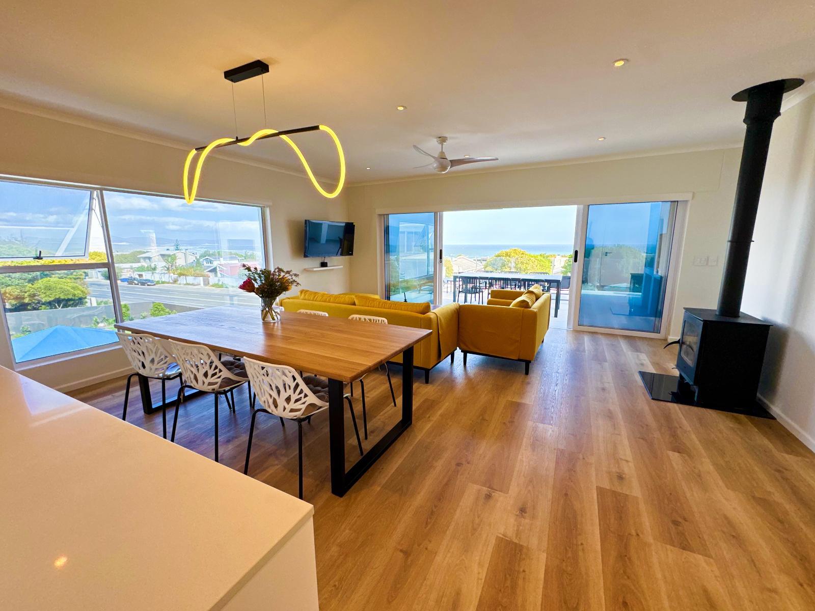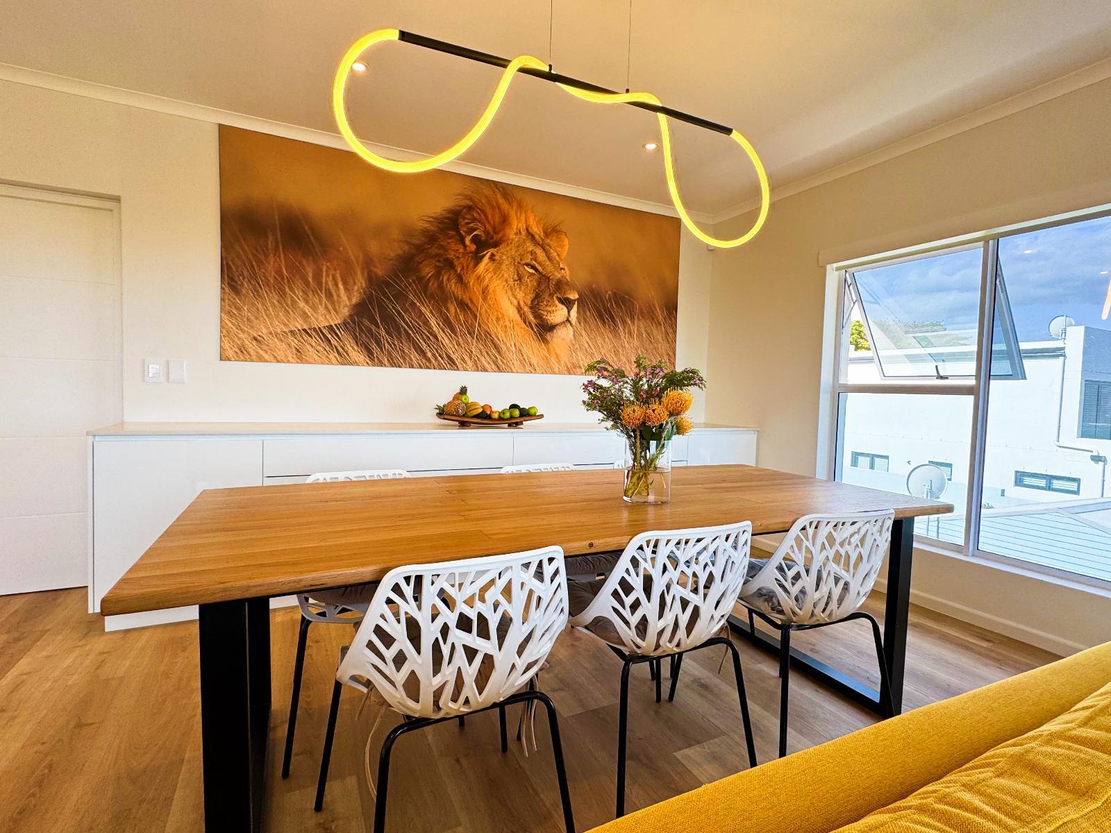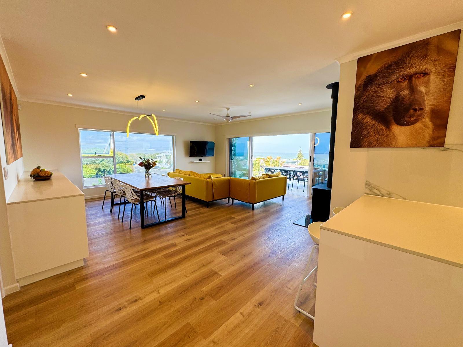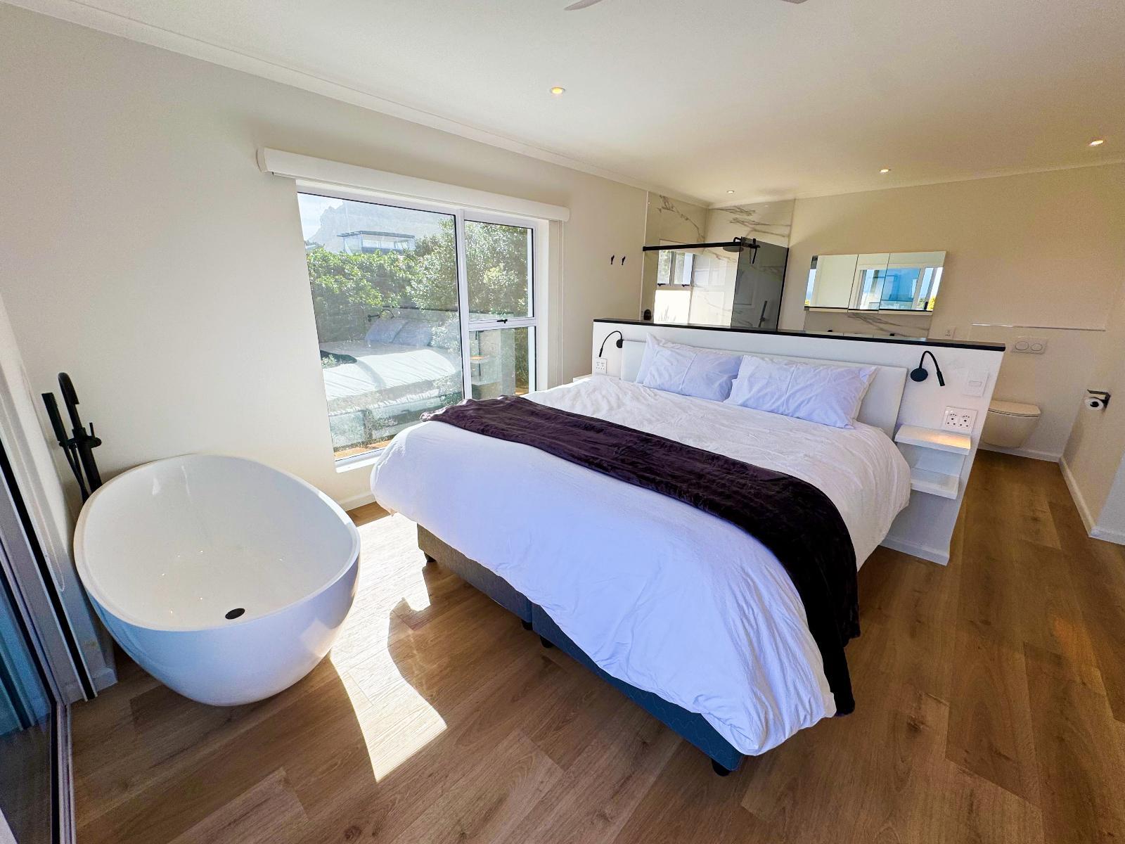 102 sqm 2-bedroom apartment with king extra-length beds, en-suite bathrooms, open plan living/dining room, Wi-Fi, 50’ smart TV with Netflix, balcony with braai, sea-view. Modern kitchen with fridge, stove, Nespresso coffee machine, and appliances.