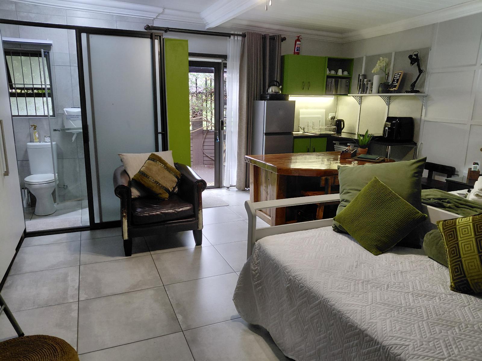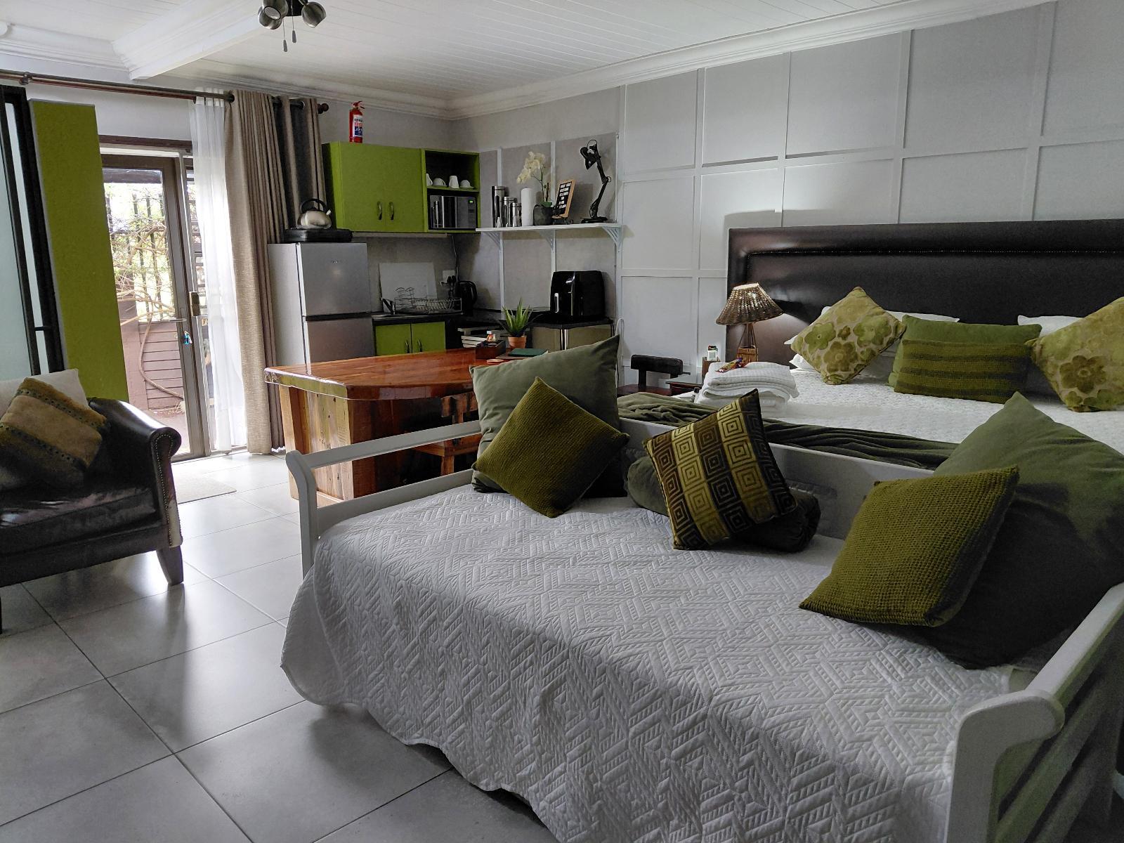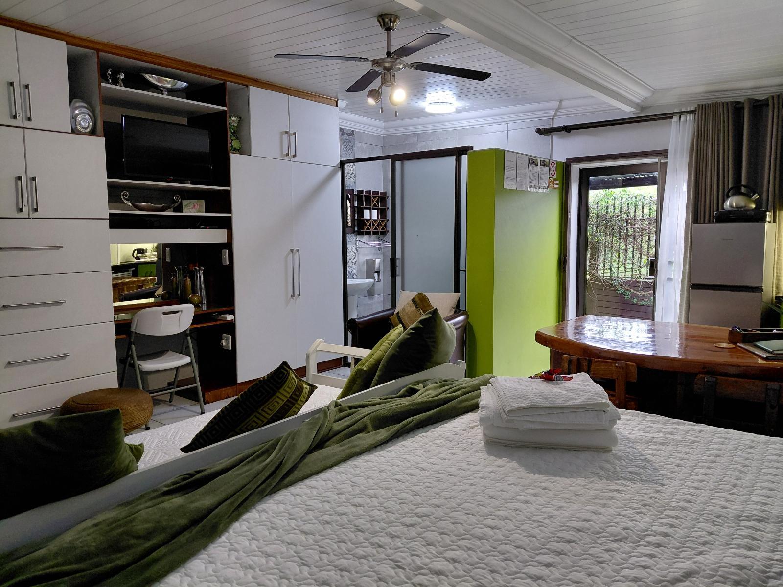 large queen size bed room with only a bath no shower. Premium DSTV, uncapped Wi-Fi, air con and ceiling fan. Kitchenette consist of microwave, kettle and bar fridge, NO COOKING FACILITIES. Own entrance door with view over Avery and koi pond. Safe parking