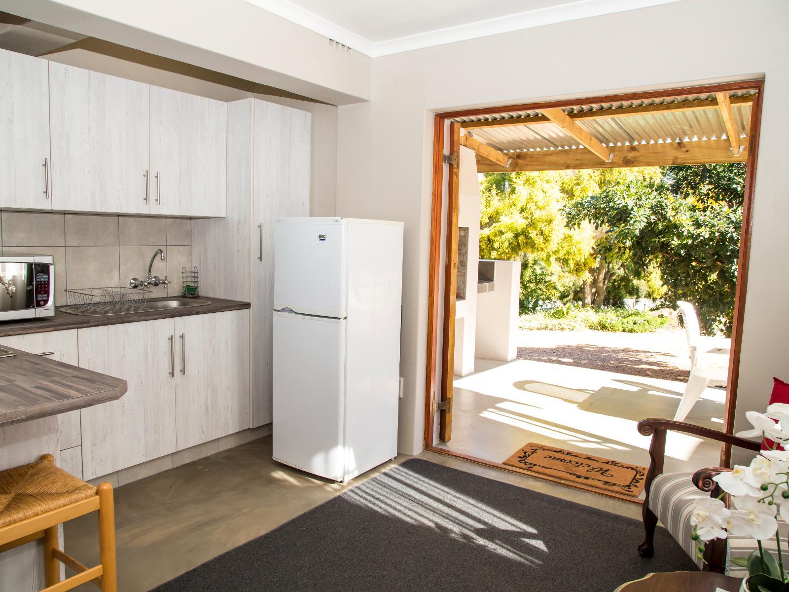 Modern 2-bedroom unit with en-suite and guest bathrooms, kitchenette (oven, microwave, fridge), and open-plan living area. Enjoy a private stoep with built-in braai and mountain views—perfect for families exploring Barrydale and Route 62.