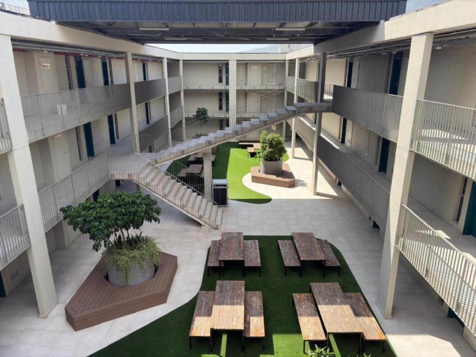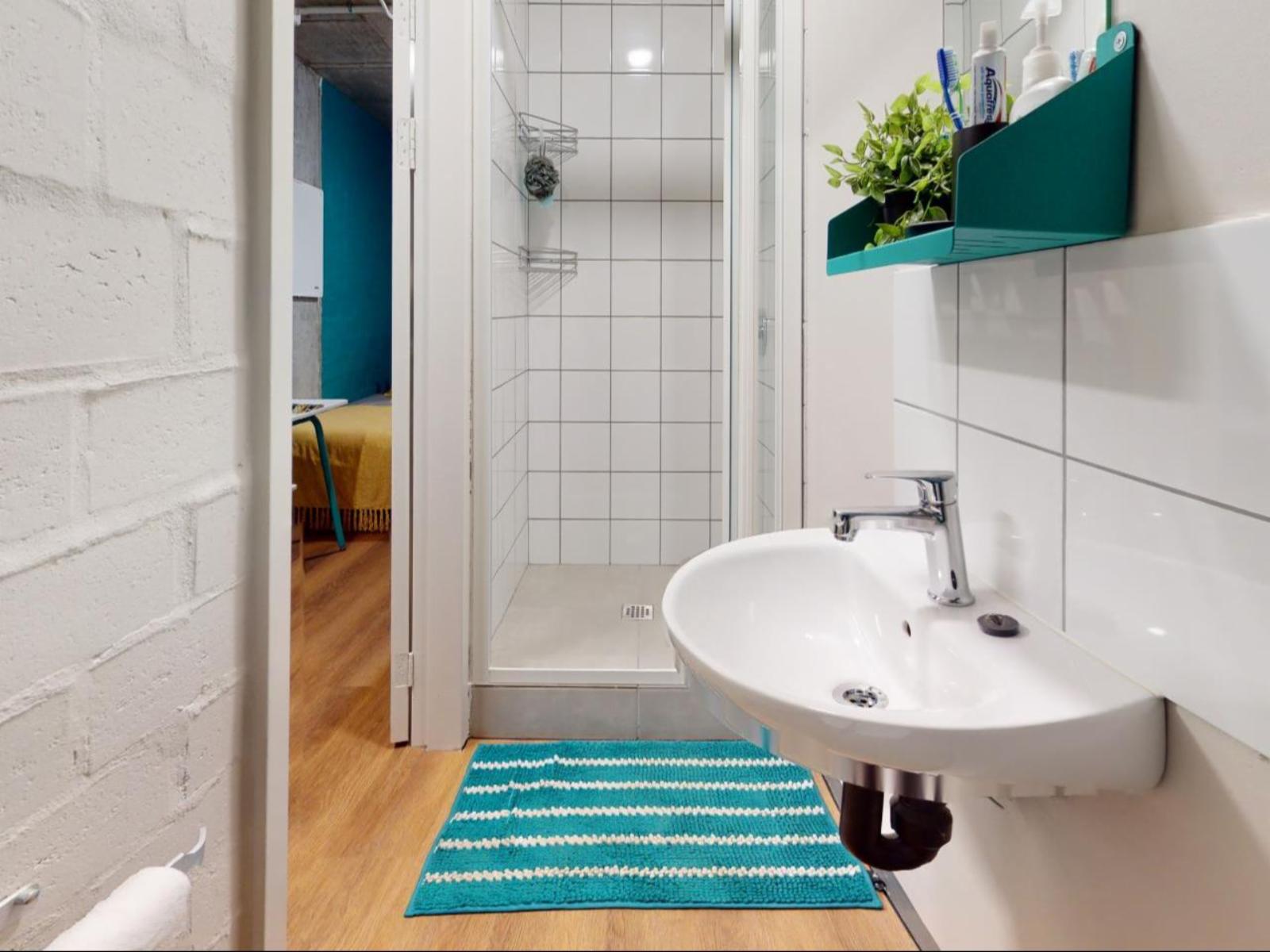 4-bedroom apartment: Four private lockable bedrooms, one shared bathroom, a kitchenette and kettle, study desks and chairs in each room. Common areas: huge living and dining area, gym, shared study zones, laundry facilities, and outdoor courtyard.