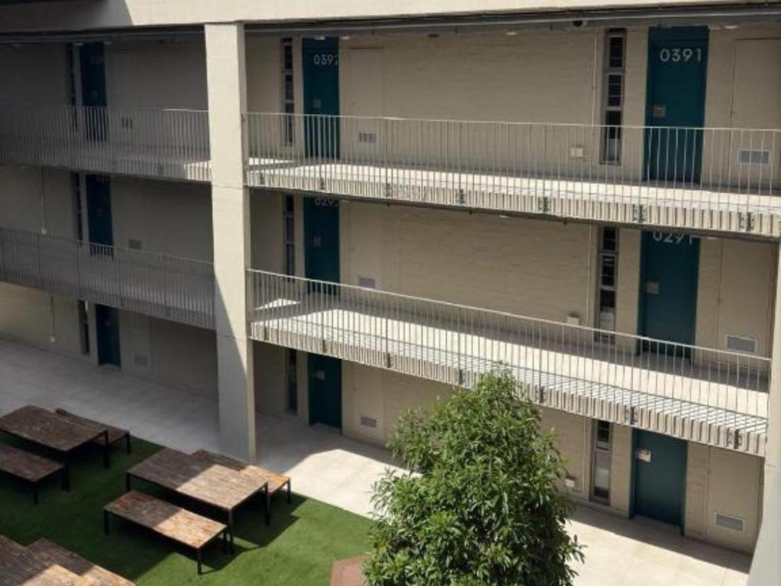 Three-bedroom unit features three lockable private bedrooms, one shared bathroom, a kitchenette and a kettle. Each bedroom has a bed, study table, chair and lamp. Community amenities include lounges, a gym, study spaces, laundry and an outdoor courtyard.
