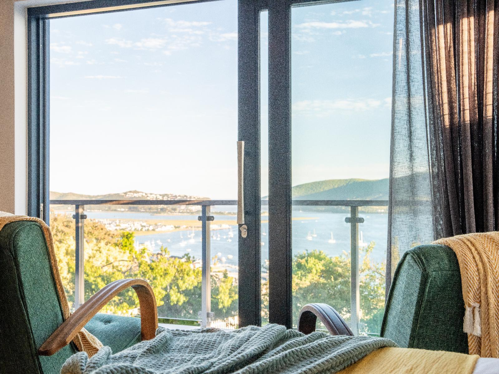 Within 2 km of the Knysna Waterfront, Baleia Guest House is a newly built modern guesthouse in the heart of the Garden Route. Tucked away in the peaceful suburb of Heuwelkruin and just minutes from the vibrant centre of Knysna, this 7-bedroom hideaway offers a seamless blend of nostalgic 70s vintage flair and elevated luxury living. Step into a space where sustainable design meets soul-soothing style. Each room is uniquely curated with retro charm, sleek finishes, and thoughtful colour palettes, anchored by king-size beds and modern comforts. Six of the bedrooms boast panoramic views of the Knysna Estuary, the iconic Knysna Heads and distant sea views of the Indian Ocean, whilst the other room is pool-facing. The bedrooms feature high ceilings and luxury vinyl flooring. All rooms include 2 yoga mats, a smart TV with Bluetooth, USB and C-type charging points, international adapters, full-length mirrors and block-curtains, as well as double-glazed windows. The bathrooms are fitted with a spa-style shower, sensor light, and magnifying mirrors. Whether you're starting your day or winding it down, Baleia has a space for every mood. Our sun-drenched breakfast room invites you to begin your mornings with a delicious buffet of fresh fruits, cheeses, breads, and made-to-order hot dishes, all included in your stay. Choose to dine indoors or enjoy your meal on the poolside patio, where the sunlight and serenity create the perfect atmosphere. Inside, the open-plan lounge and kitchen are designed for connection and comfort. Styled to perfection, the fully equipped kitchen flows effortlessly into a cosy lounge anchored by a central fireplace, ideal for cooler evenings. In summer, air conditioning keeps things cool, so you can unwind on plush seating, help yourself to a drink from the honesty bar, and settle in with a good book or a glass of local wine. Outside, the tranquil rhythm of Knysna continues with a sunny plunge pool, complete with a martini seat, loungers, and whimsical flamingo ornaments that add a playful charm. As dusk falls, gather with fellow travellers around the fire pit area, sharing stories under the stars. To elevate your stay, enjoy access to exclusive sailing, whale watching, and eco-marine adventures with our trusted partners: Ocean Odyssey and Springtide Charters Knysna, an unforgettable way to experience the coastal magic of this scenic coastal destination. The Knysna Waterfront is 2 km away, whilst attractions like the Knysna Heads viewpoint are within 9 km, and the Knysna Elephant Park is 25 km away. For golfing enthusiasts, the Pezula Championship Golf Course and Simola Golf and Country Estate are within a 15-minute drive of The Baleia Guesthouse. Drink sustainably with us! Our guest house features a state-of-the-art 3-stage water filtration system, equipped with AFM and UV filters, providing purified water throughout our entire property. By choosing to stay with us, you're reducing your carbon footprint and helping us minimise single-use plastic bottles. From nostalgic interiors to luxurious comforts, Baleia Guest House is your gateway to stylish relaxation in one of South Africa’s most scenic towns along the Garden Route.