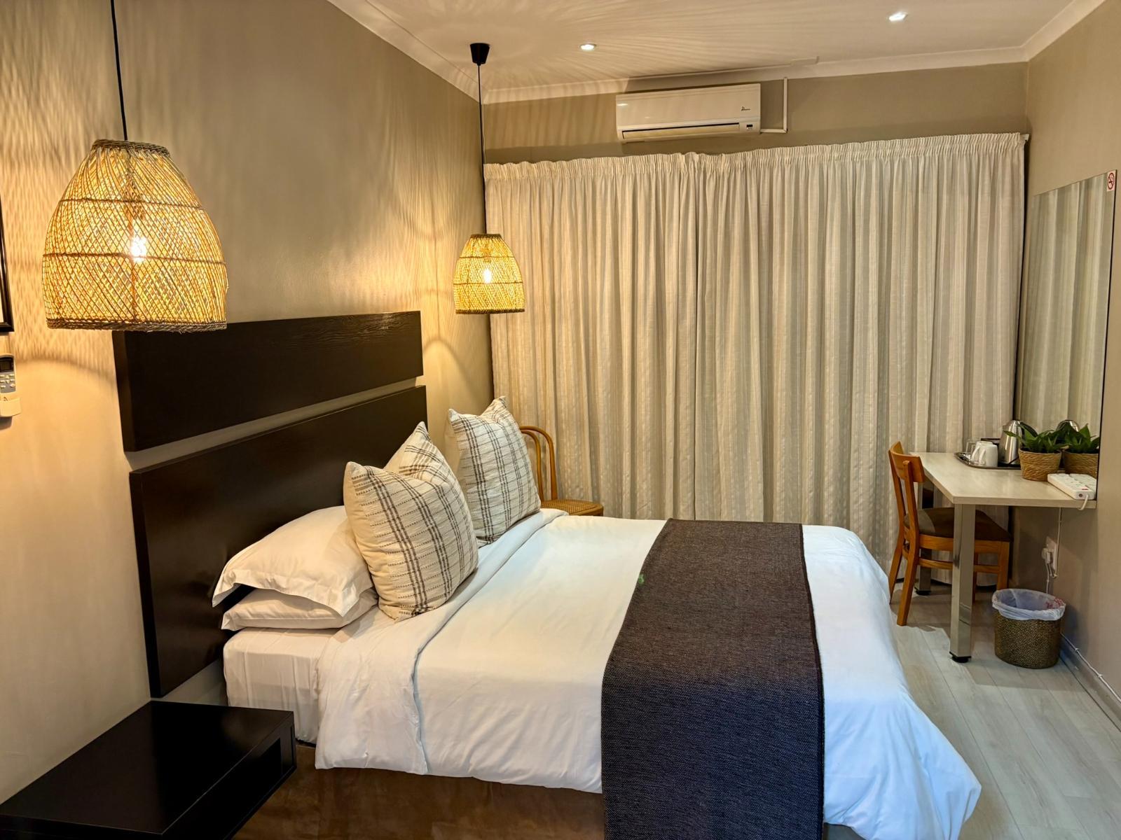 The Standard Queen Room features a queen-size bed with crisp percale linen, a spacious shower, air-conditioning, bar fridge, 42cm LED TV with DStv, work station, coffee and tea facilities, free Wi-Fi