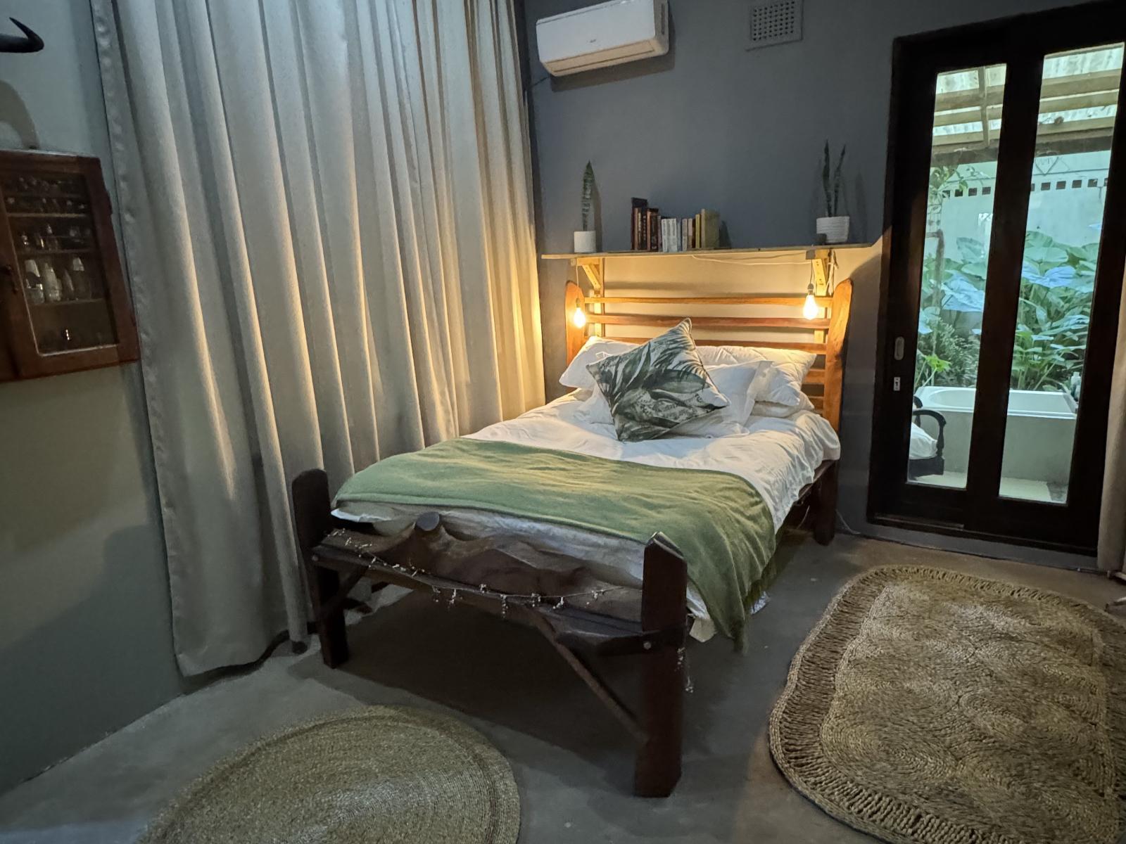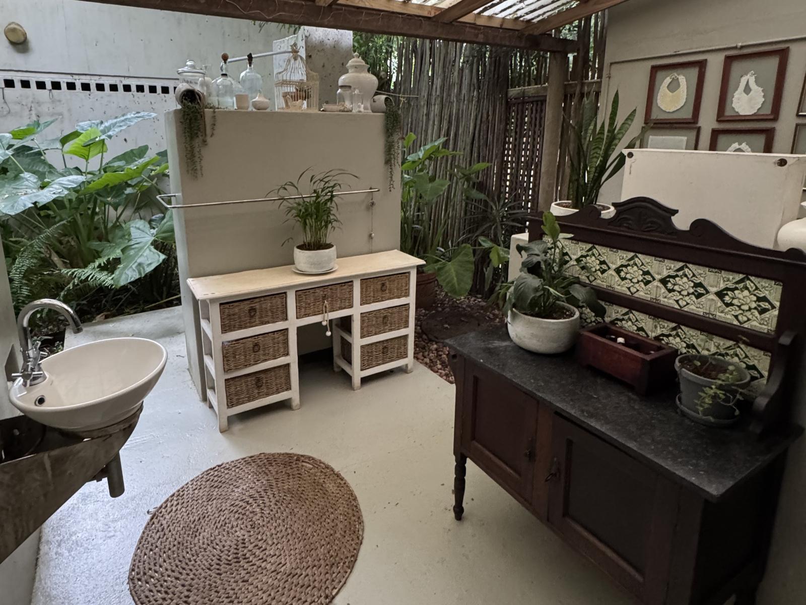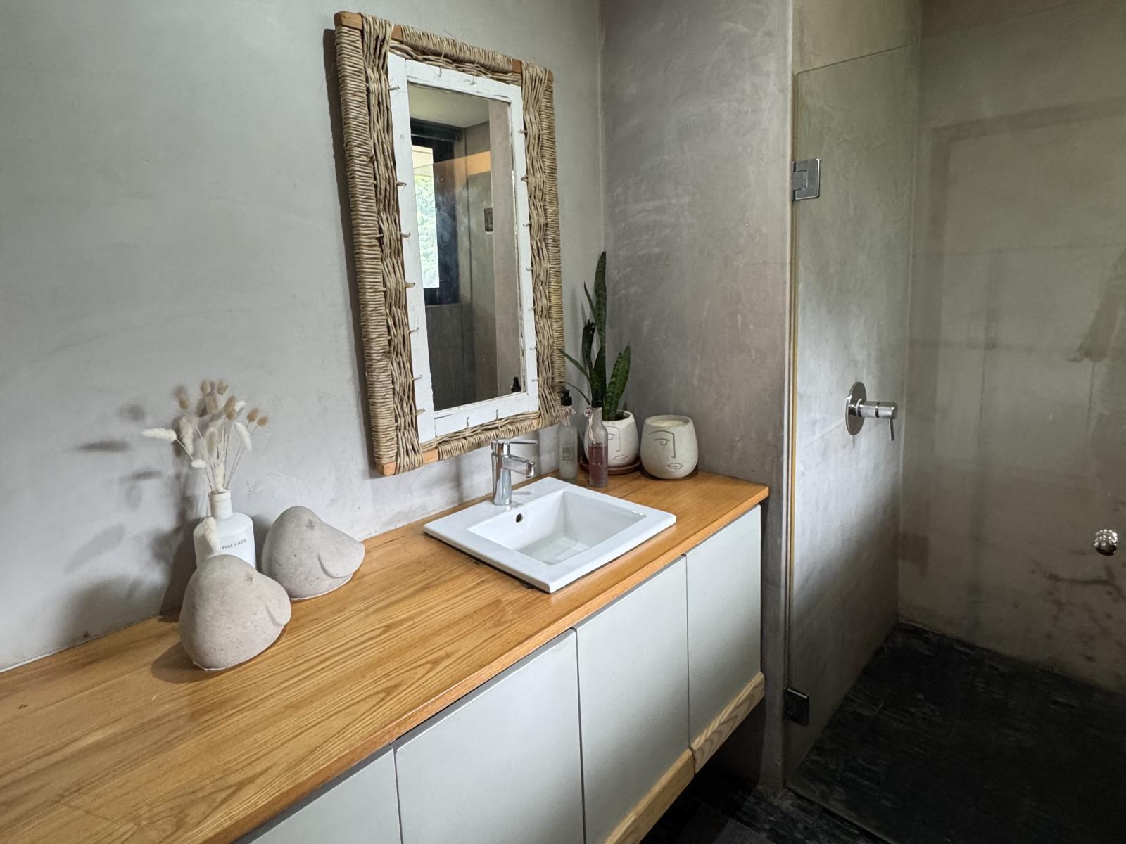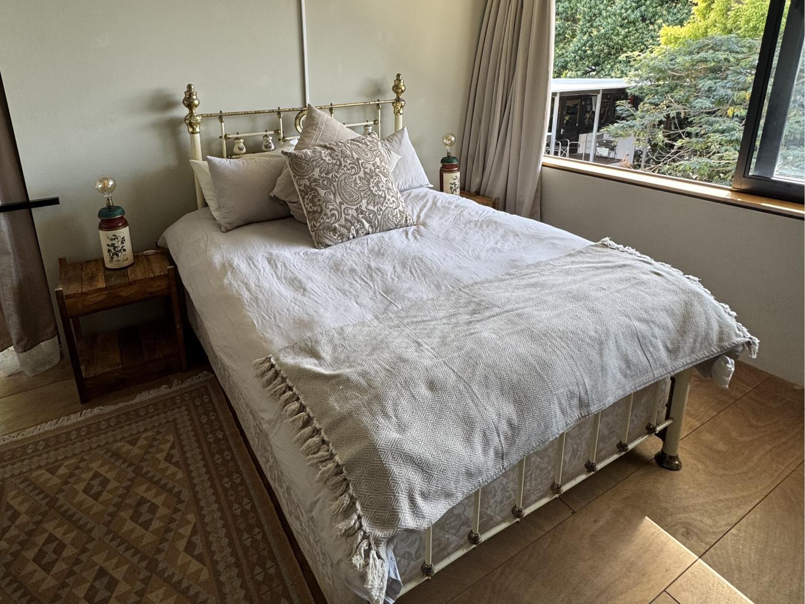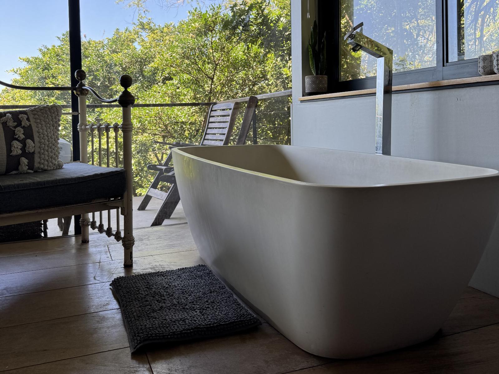 Spacious 6-bedroom treehouse with 5 bathrooms, pool, 2 lounges (Netflix & DStv), a library, fully equipped kitchen, multiple workspaces, stoep, 2 braai spots, and a separate en-suite flat. One private room includes a fridge. Outdoor shower & study nook.