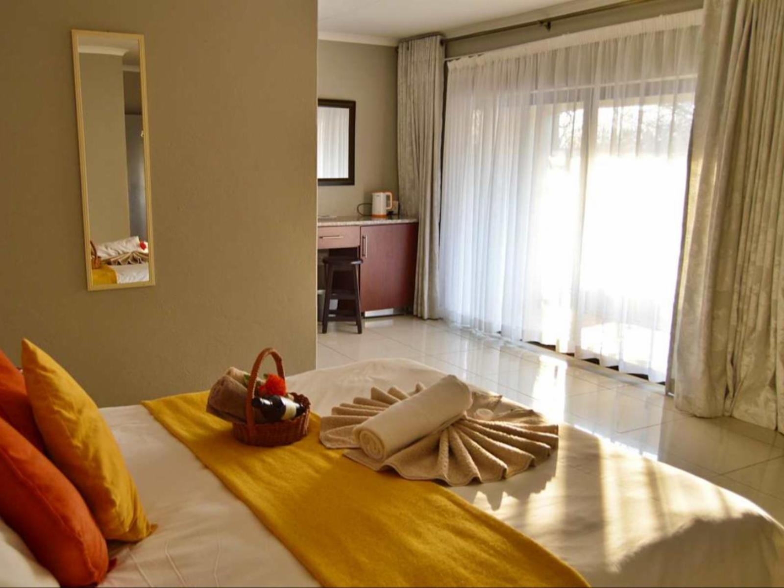 Luxurious and spacious room with an en-suite bathroom with shower, Queen bed, balcony or patio, air-conditioning, bar fridge, TV with selected DSTV channels, Coffee station