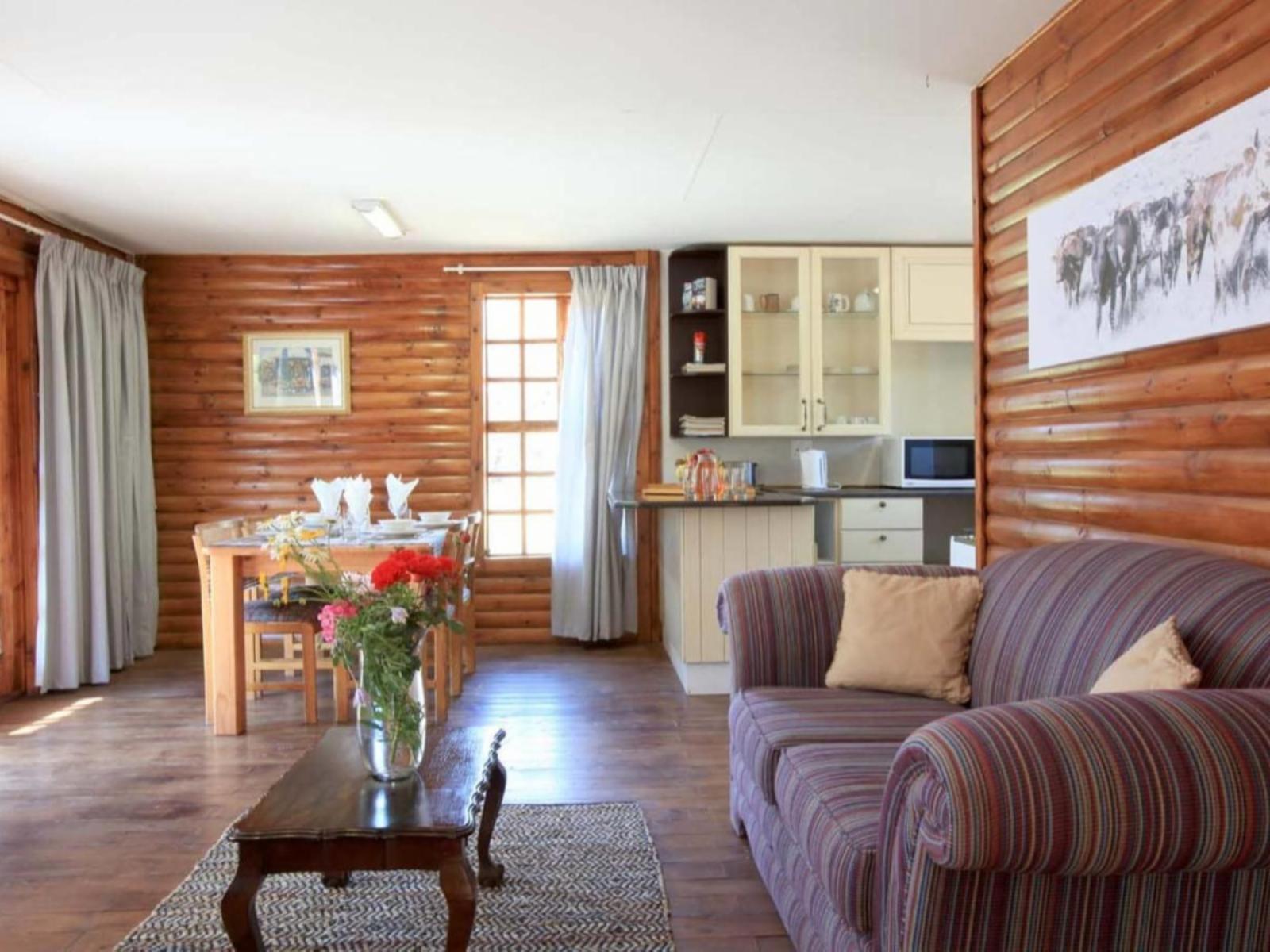 With stairs leading up to the log cabin, it offers 2 bedrooms, a bathroom with a bath and a shower. It includes a living and dining area, a kitchenette with a gas stove and a patio with a view over the dam and the mountain.