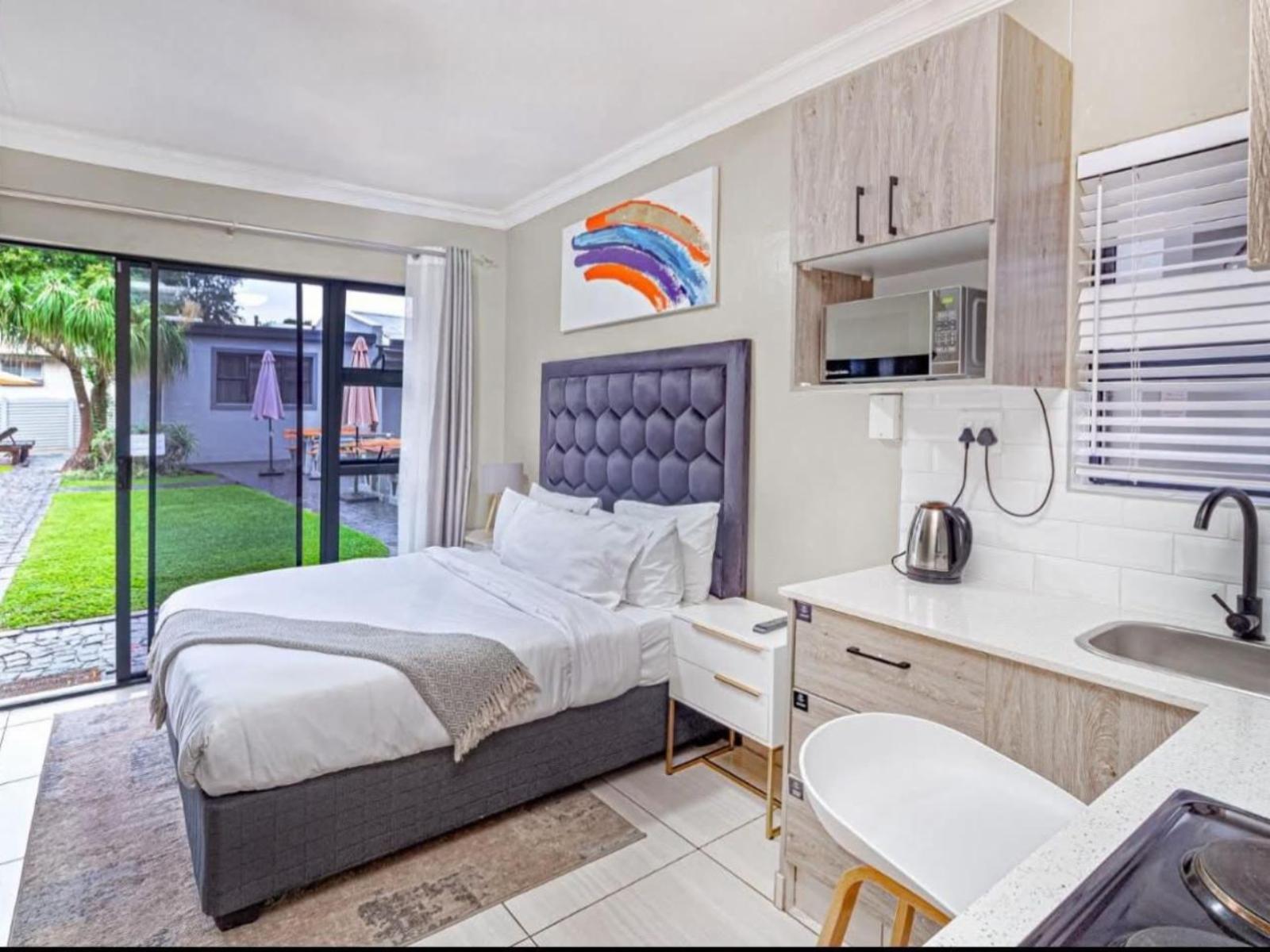 This suite features a luxurious king-size bed, an en-suite bathroom, a stylish dining area with a table for added convenience, and outdoor dining furniture on the balcony. Overlooking the garden, the unit offers a peaceful retreat with modern amenities.