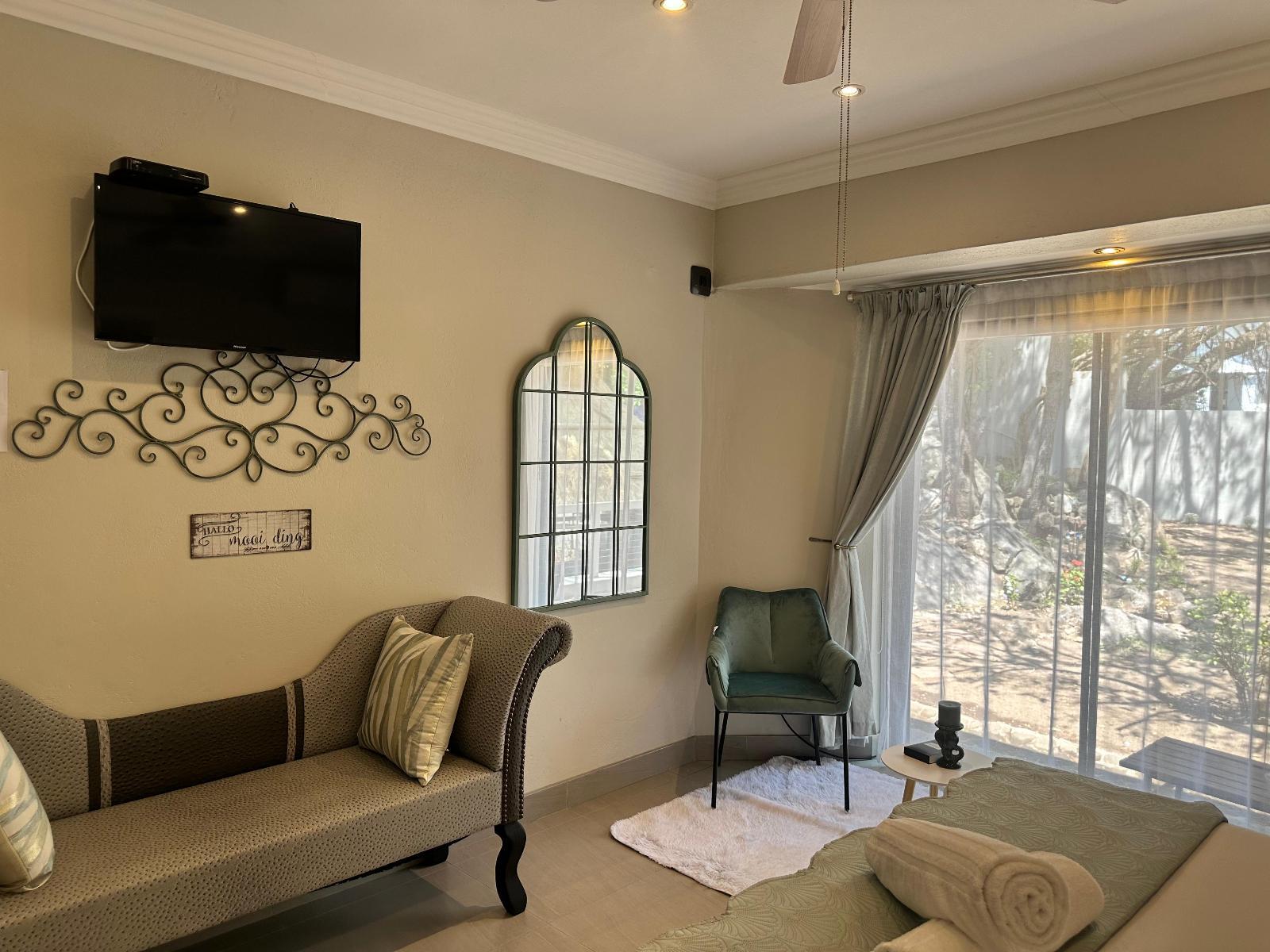 This standard room has a king bed and en-suite bathroom with a shower. Amenities include air-conditioning, a hairdryer, coffee and tea-making facilities, a shared lounge and a TV with DStv and Wi-Fi. The patio offers serene garden views.