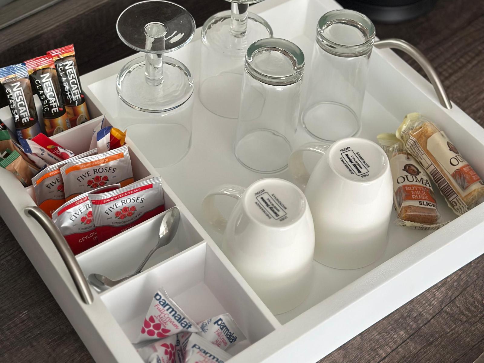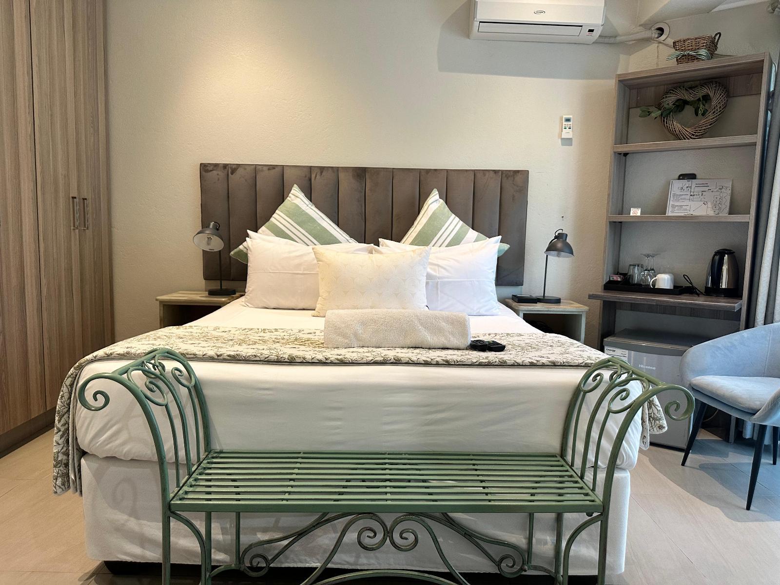 This queen room deluxe has a queen bed and the en-suite bathroom includes a shower, wash basin, and toilet. Amenities include air-conditioning, a secure safe, a convenient coffee station, a TV with DStv, and direct access to the garden.