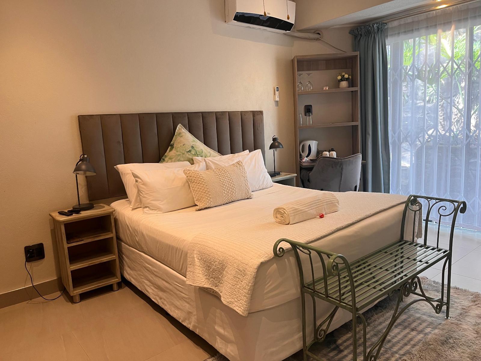 This luxury room has a double bed and shares a bathroom with another room. This room features a shared open-plan lounge and a fully equipped kitchen. Amenities include air-conditioning and a TV with DStv. Access is via an external staircase.