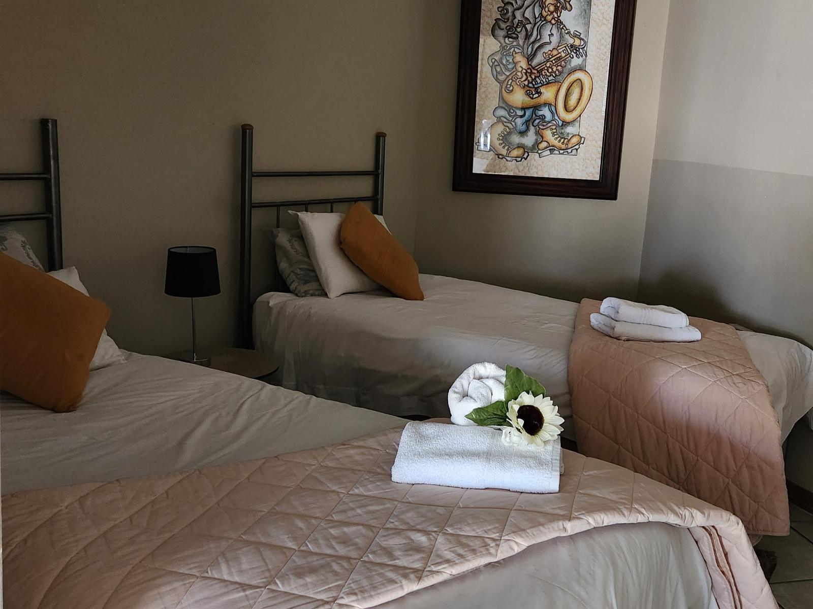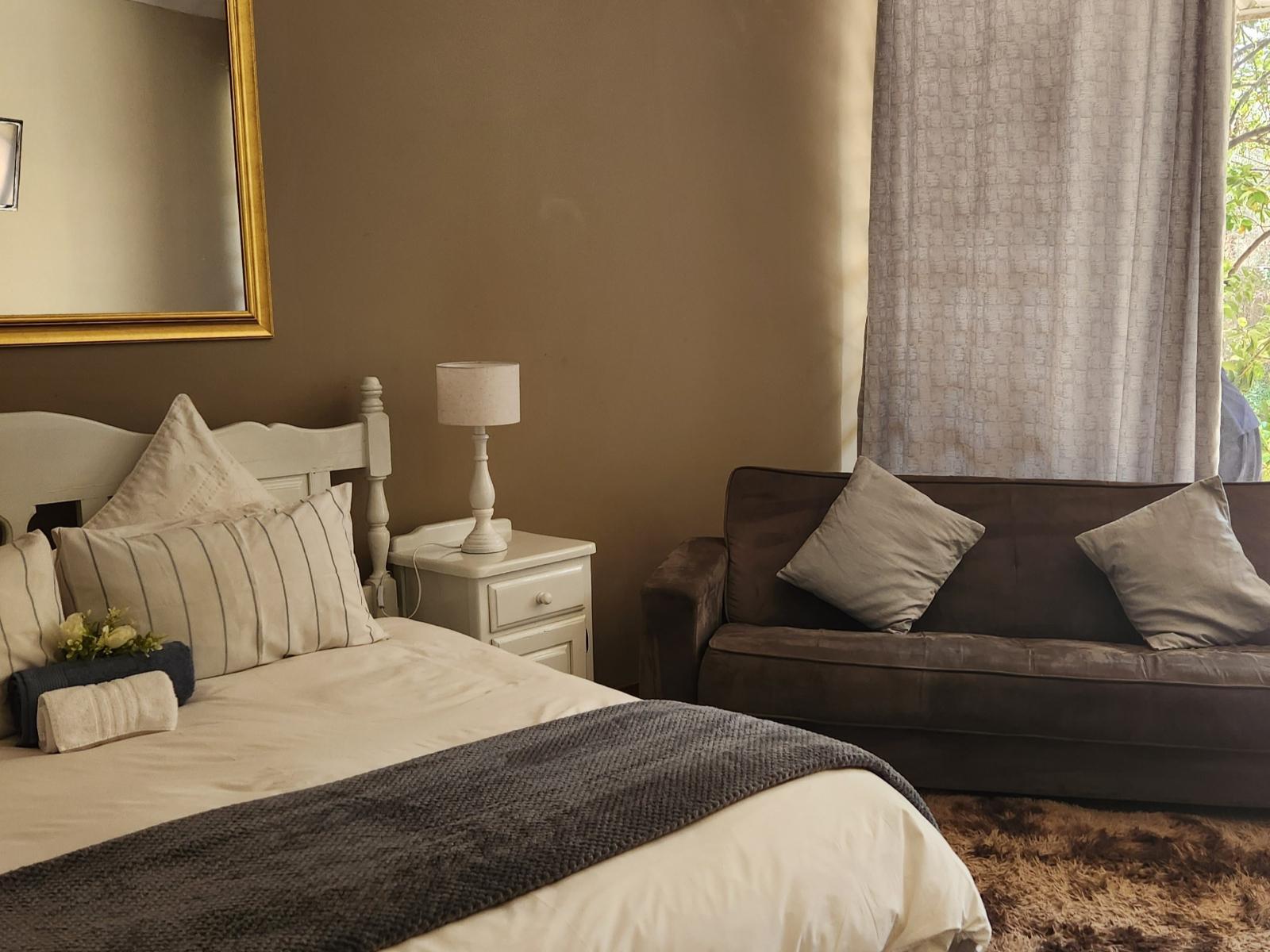Luxury Downstairs Triple Room (sleeps 3 guests), with an en-suite bathroom with towels and toiletries. Each unit is equipped with a mini fridge, a coffee station, and a TV with DStv (extra channels than the normal bouquet).